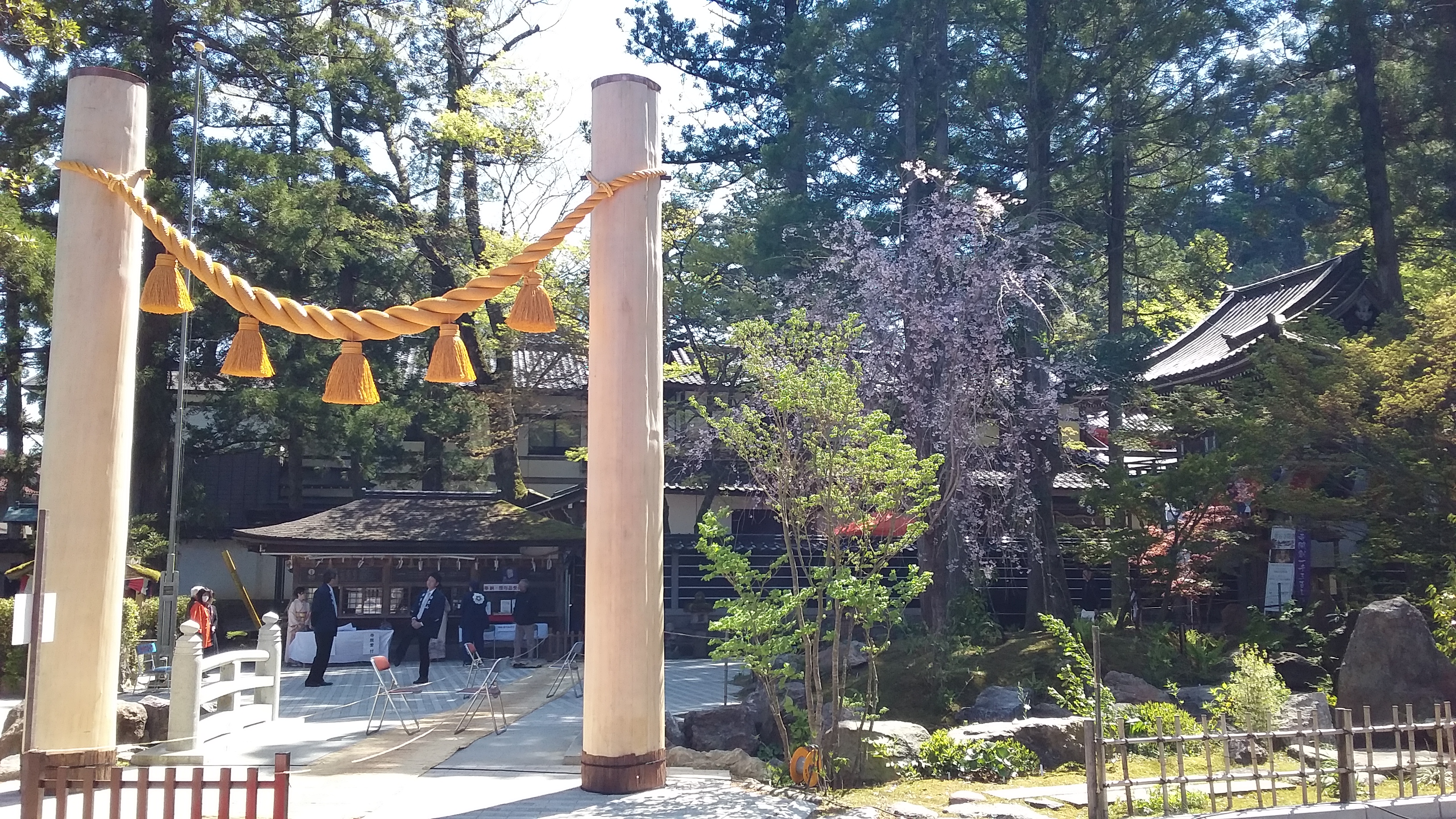 先月建った御柱 大きいですね。 まだ始まる前だったので皆さんリラックスリラックスですね。